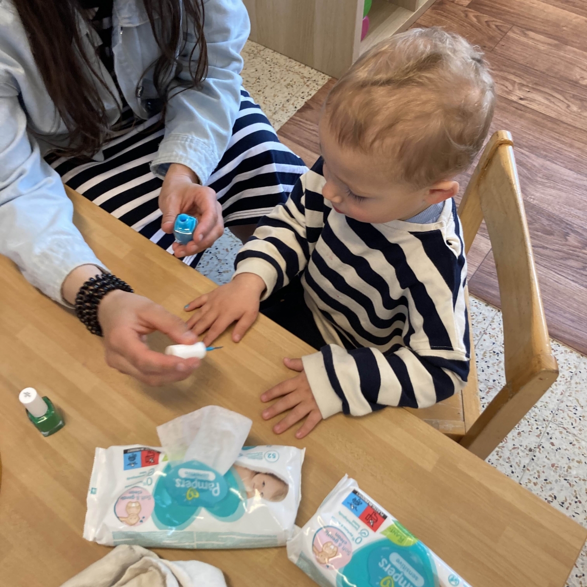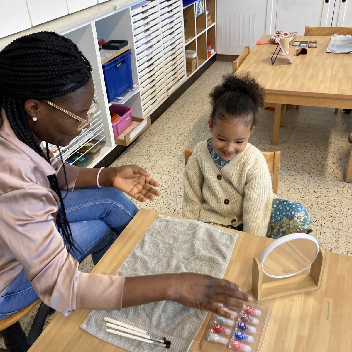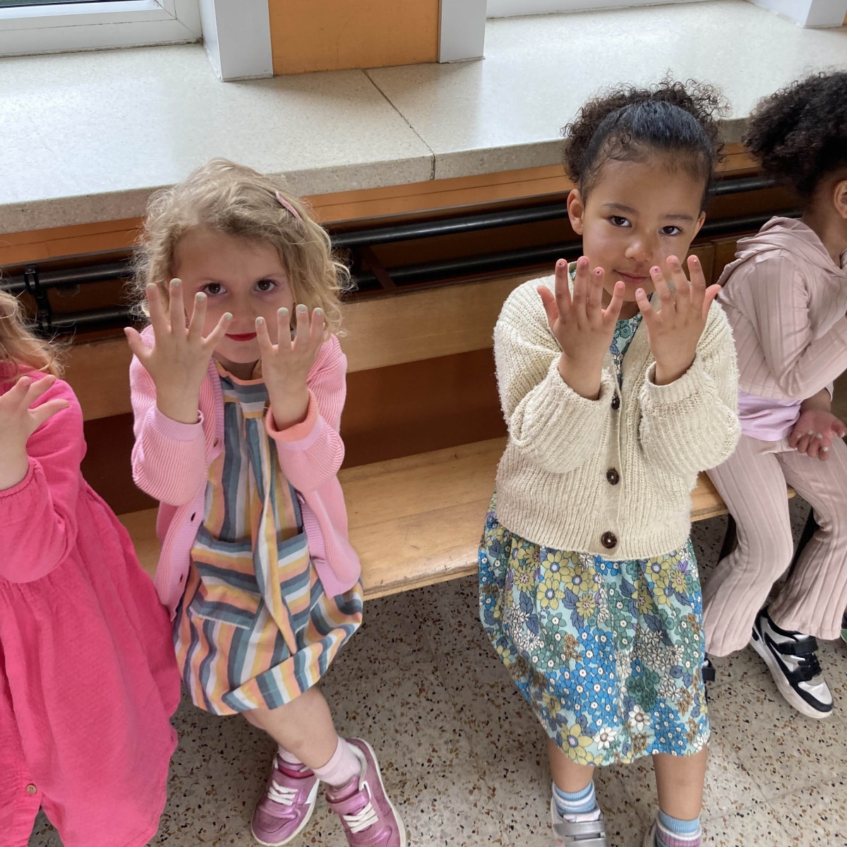 Enkele mama's kwamen met hun make up tasje naar de klas om vingernageltjes, wangen, ogen en lippen een kleurtje te geven. Door de beleefmomenten wordt de betrokkenheid van ouders hoger.